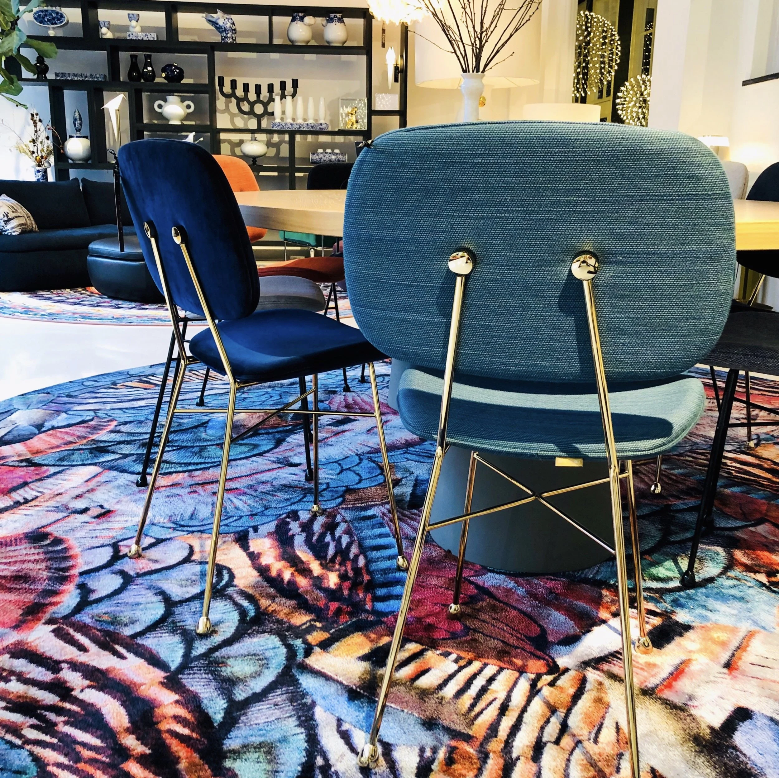 Back to colour and textiles, the various chair styles that dot about the showroom also showcase the continued use of (often) bold colour and with different fabric finishes. The Charles chair a Marcel Wanders design with it’s simple frame base structure is most definitely an iconic piece. It can look strikingly different by the simple change of colour and finish. You will have seen many chairs in companies such as Made.com that have cost definitely been derived from this design. Similar in it’s simplicity is the Golden chair, a simple design based on and reminiscent of a simple school chair but with a fine frame and fab array of finishes. I really love these!!